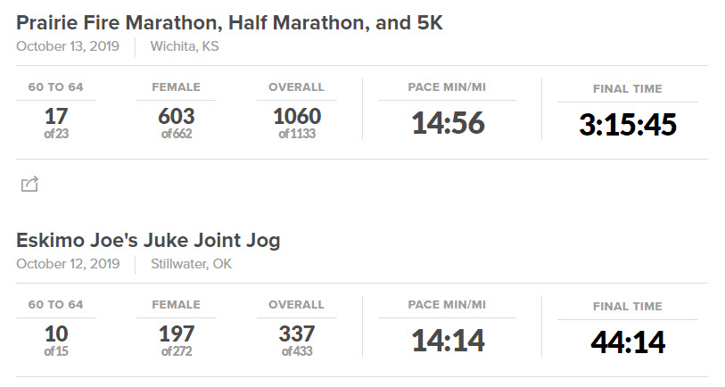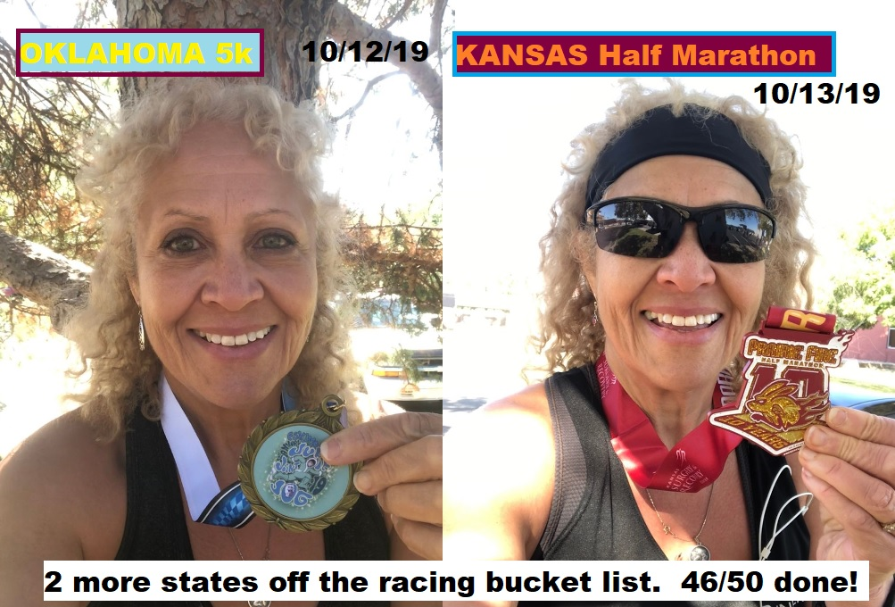My previous post almost 10 months ago caught up a lovely summer of racing in 2019 — actually the last lovely summer of racing since then, which I had no way of knowing at the time. The fall of that year brought another 2-state destination race jaunt when I visited Oklahoma and Kansas for a 5k Saturday and half-marathon Sunday weekend.