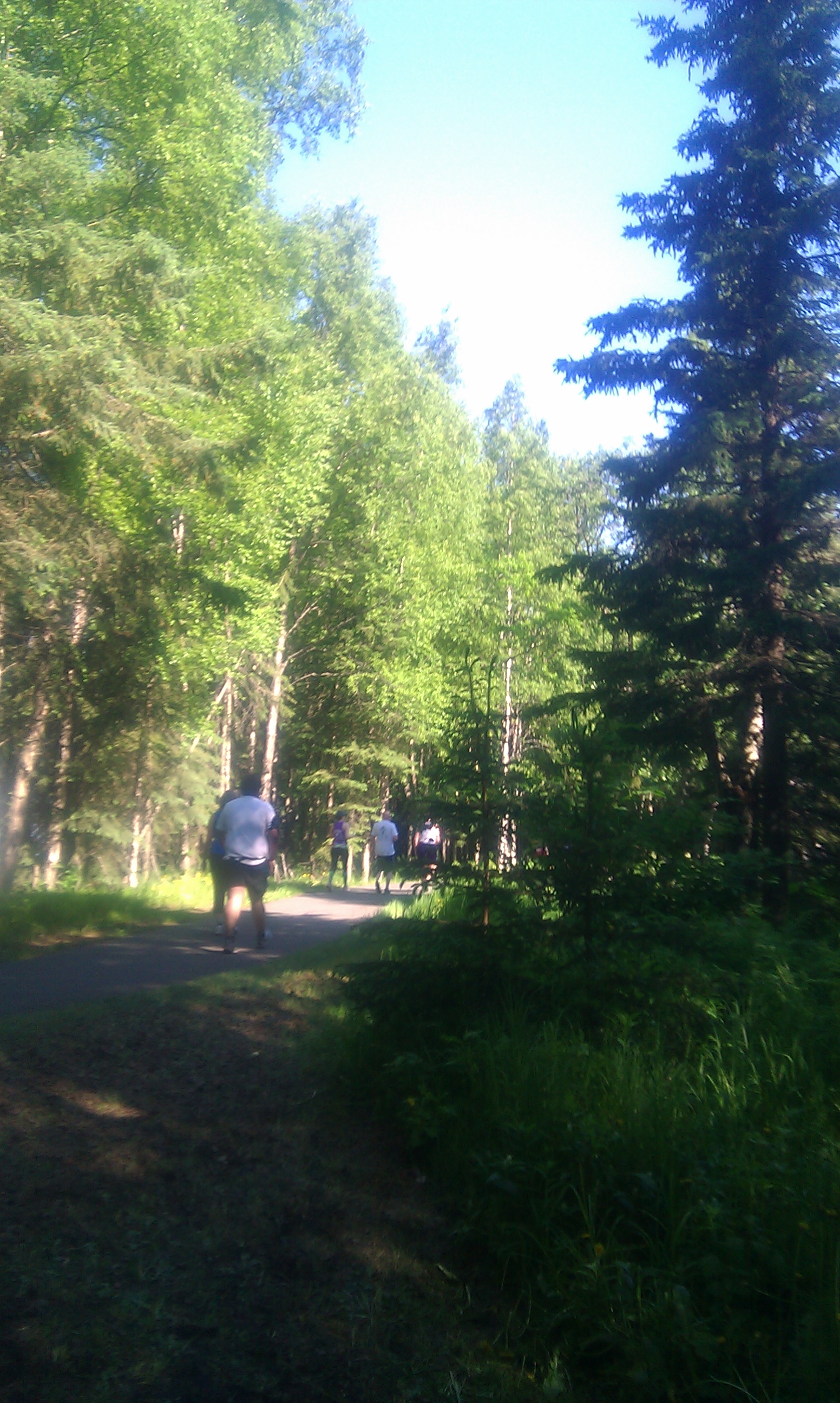 At one point we found ourselves on a crowded paved path which was shared with the general public, and a disconcerting dance with the bicyclists began. Approaching us from both front and rear, they zoomed past leaving breezes and sometimes impatience in their wake. Unfortunately, a teenage girl riding with her family tried to weave between the runners but lost control and fell to the ground with a pitiful shriek. Several runners and I turned to help her but her mom waved us off, saying “it’s okay, I’ve got it, I’ve got it.” So awkwardly forward we went.