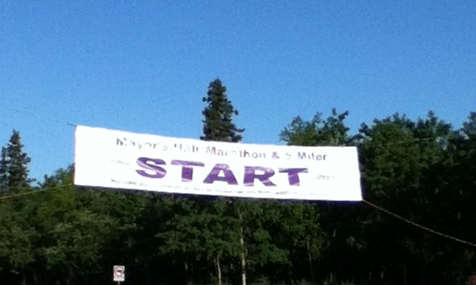 I had read a race report a few months earlier which commented on lack of organization among runners at the line and how tough it was to wade through the charity walkers scattered at the starting area. Finding this to be true, I tried to squeeze in somewhere near the back without getting stuck in the last tiers. I am not fast by any means but I didn’t want to lose time by having to fight my way to my own pace group. It seemed like people were spread out all over the place and it wasn’t easy to decide where to stand. As we neared the final moments before the gun, they played “We Are the Champions” by Queen and “Rock & Roll” by Gary Glitter, two great songs to rev up that running motor. Immediately before the gun sounded, the actual Mayor of Anchorage turned up to announce the start. I was pleasantly surprised by that. Even with the moniker of “Mayor’s” race I would never expect to see Rahm Emanuel if it was held in Chicago, so I found it quite nice (and his hair was perfect).